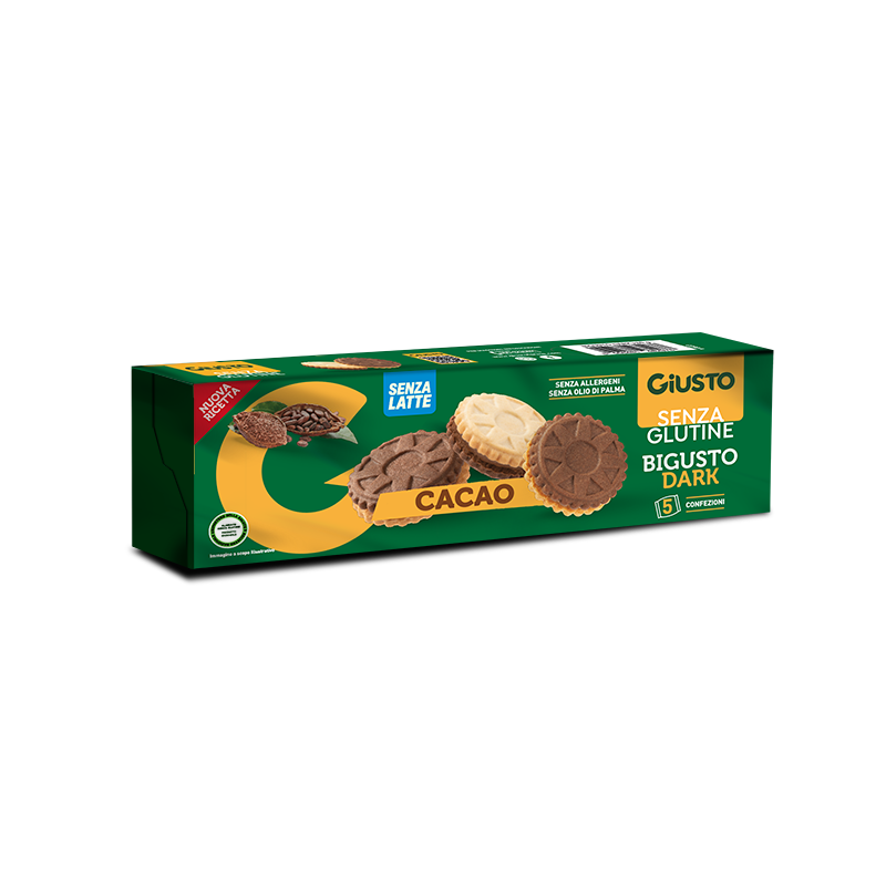 I Bigusto Dark Senza Glutine Giusto conquistano con il contrasto perfetto tra la friabilità del biscotto e la morbidezza della crema al cacao.
